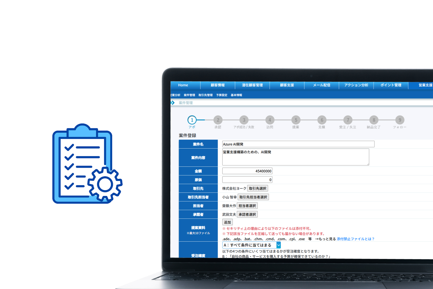 提案から受注、納品、アフターフォローまで営業プロセス全体を一元管理。