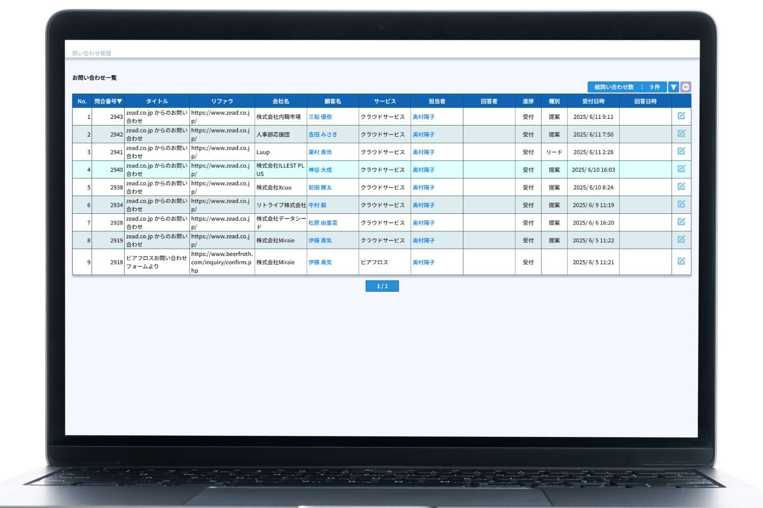 問い合わせ内容は一覧で一括管理され、受付者から回答者への割り振り、対応ステータス(受付中・対応中・完了 など)の可視化まで対応可能です。