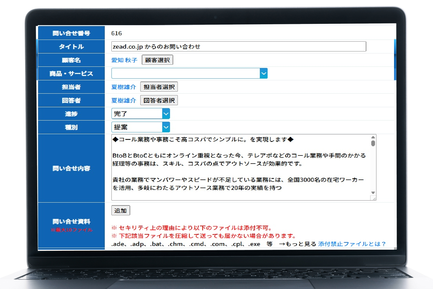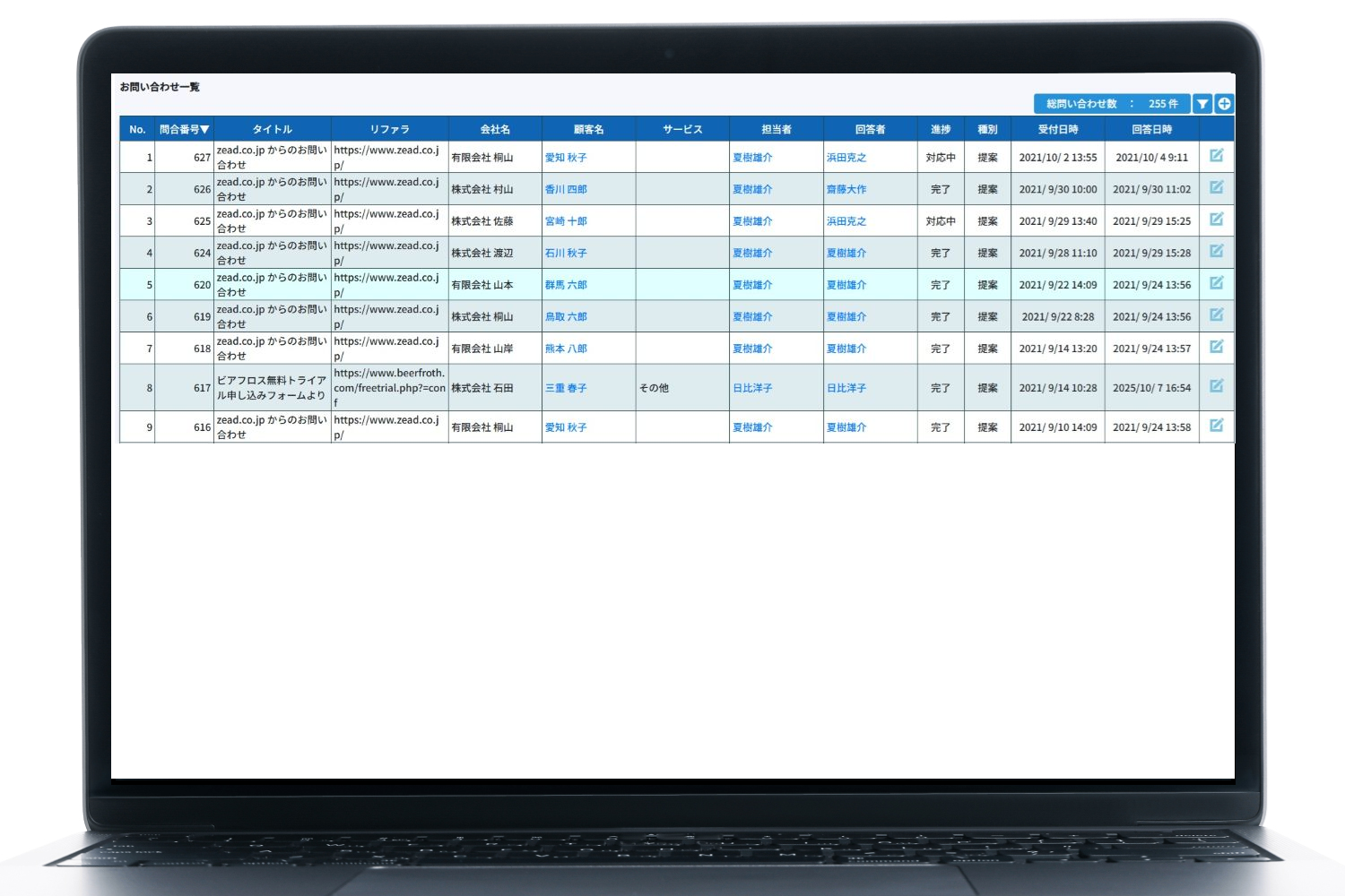 送信された問い合わせデータは自動的に蓄積され、種類別・顧客別・商品別・担当者別など、さまざまな切り口での分析が可能です。