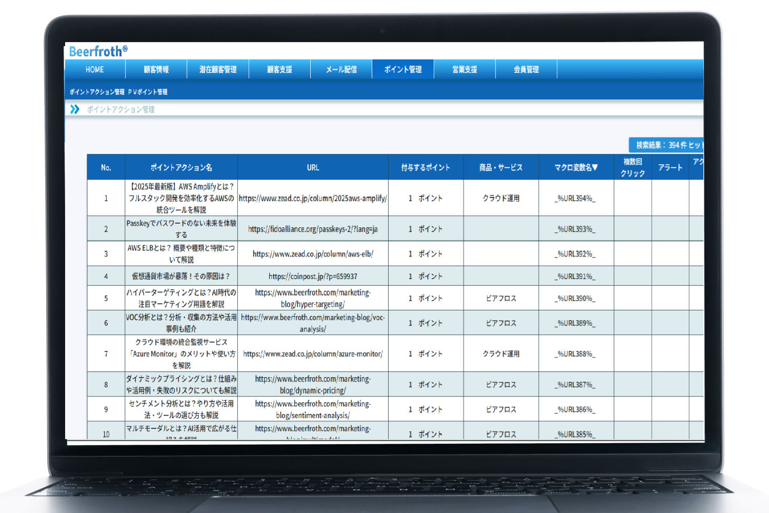 メール本文内に設置したリンクのクリック状況をポイントとして蓄積・可視化し、顧客の関心領域や検討フェーズを数値的に把握します。