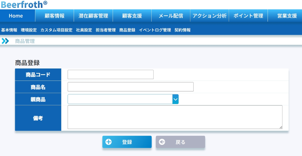 ※商品登録は『潜在顧客管理』、『アクション分析』、『ポイント管理』、『顧客支援』、『営業支援』に関係する機能です。各機能へお申込みの無い方は設定しなくても差し支えありません。「商品登録」は管理者権限でのみ表示される項目です。