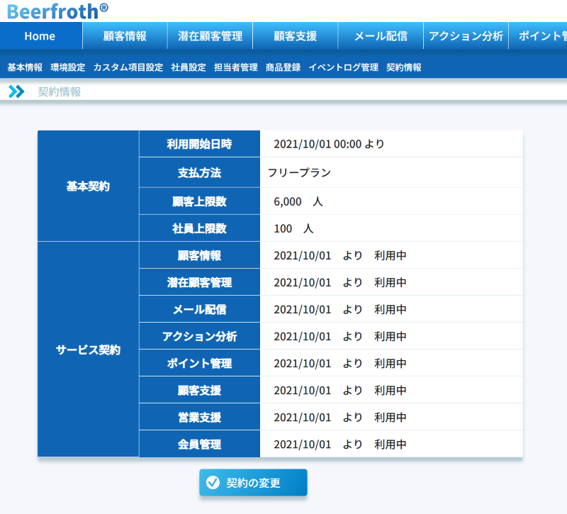 契約情報を確認するには管理者権限でログイン後、『HOME』『契約情報』の順にクリックしてください。契約変更後はただちに新しい設定が適応されます。料金は翌月から適応されます。