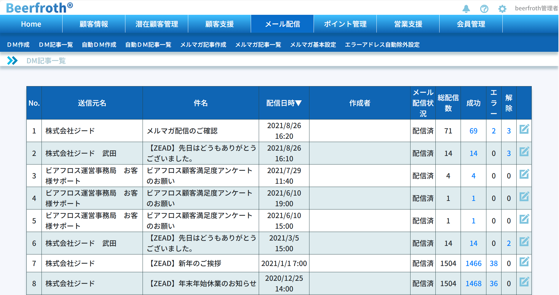 Beerfrothのメール配信機能は大きくDM(ダイレクトメール)機能、メルマガ(メールマガジン)機能の2つに分けることができます。