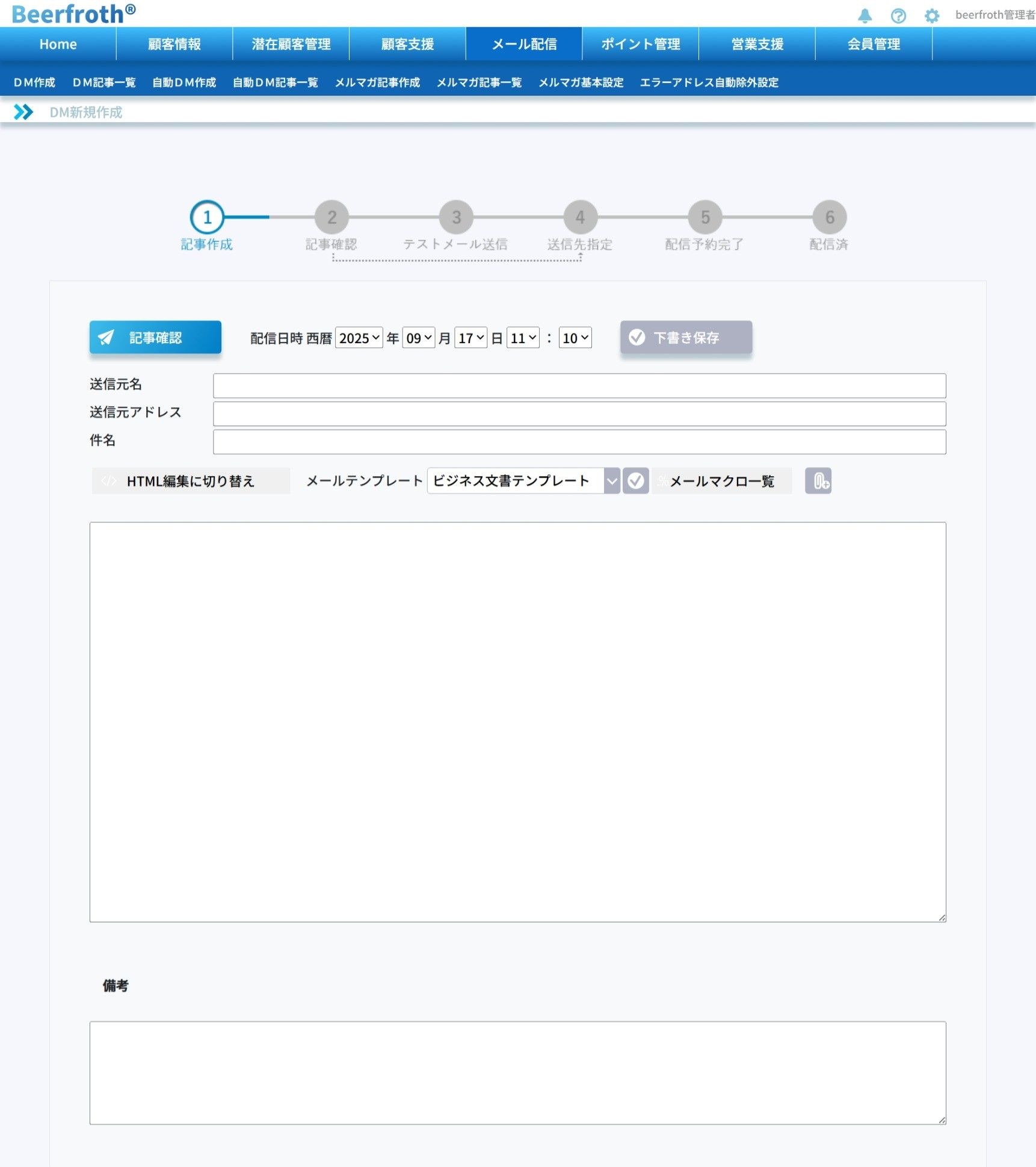 ダイレクトメールを配信するにはまずダイレクトメールの本文を作成します。各項目の説明は以下の通りです。入力が終了しましたら画面下部の「記事確認」ボタンをクリックし、次の画面に進みます。