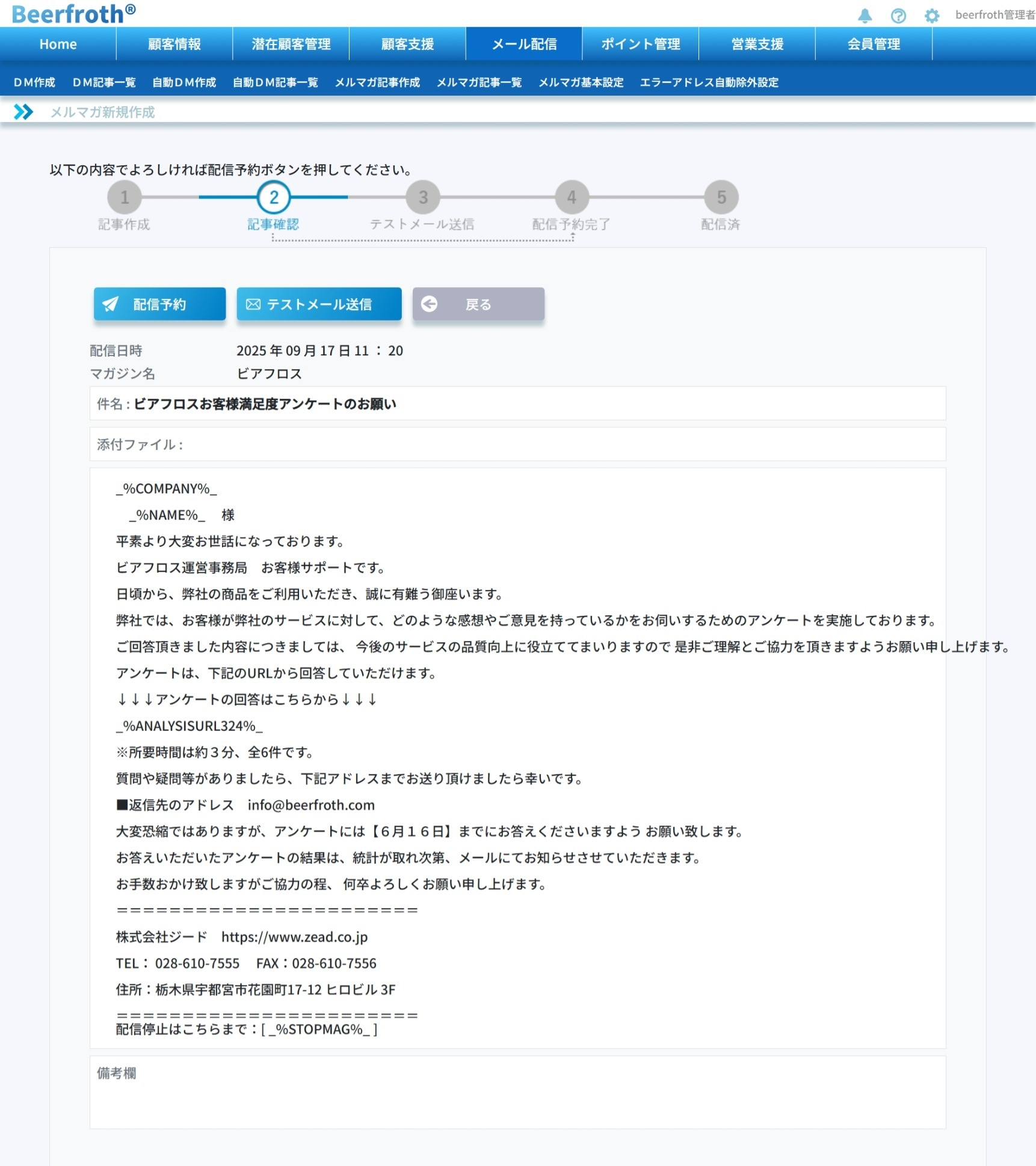 Beerfrothの確認画面と実際送られるメールは表示が若干異なりますので、確認のためテストメールを送信することを強くお勧めします。メールマクロを使用している場合はテストメールの送信を利用してメールマクロが正常に動作しているかを確認することができます。