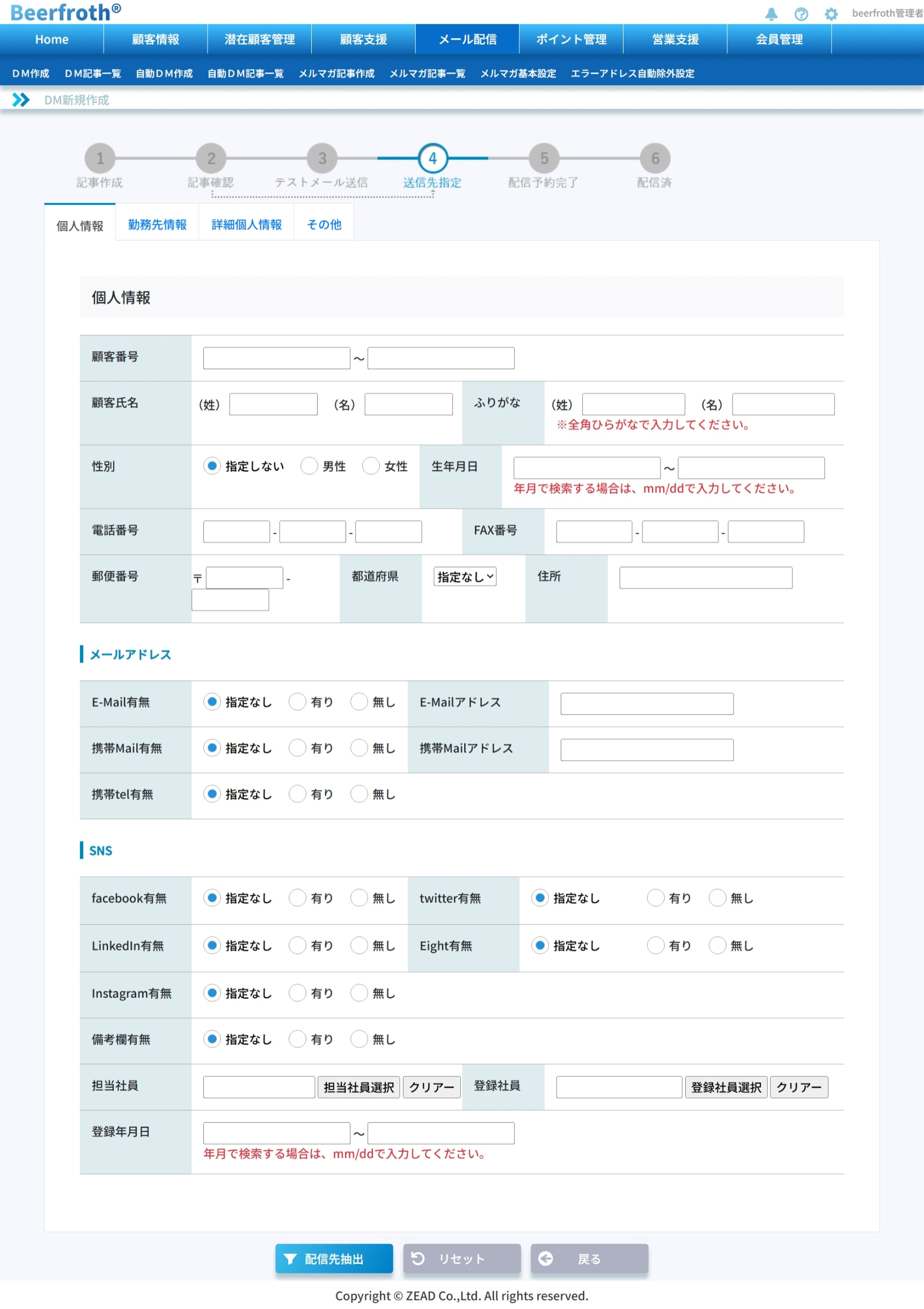 ダイレクトメールの受信設定をしている顧客すべてにメールを配信する場合は「顧客番号」の左側のチェックボックスにチェックをいれ、右側の条件はそのままで、画面下部の「顧客抽出」ボタンをクリックします。