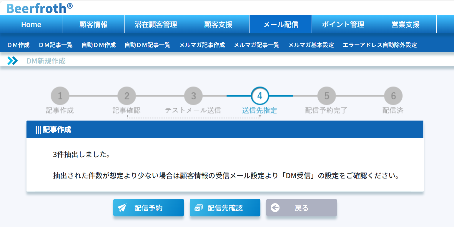 配信先を指定が完了すると配信予定の顧客数が表示されます。この状態で「配信予約」ボタンをクリックすれば、ダイレクトメールの予約は完了です。最初のダイレクトメール作成画面で設定した配信日時に、ダイレクトメールが自動配信されます。