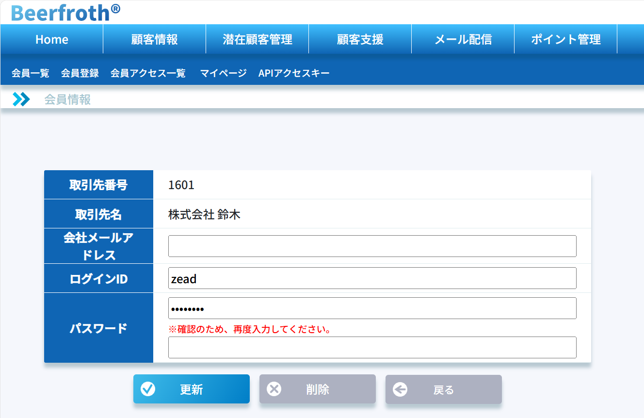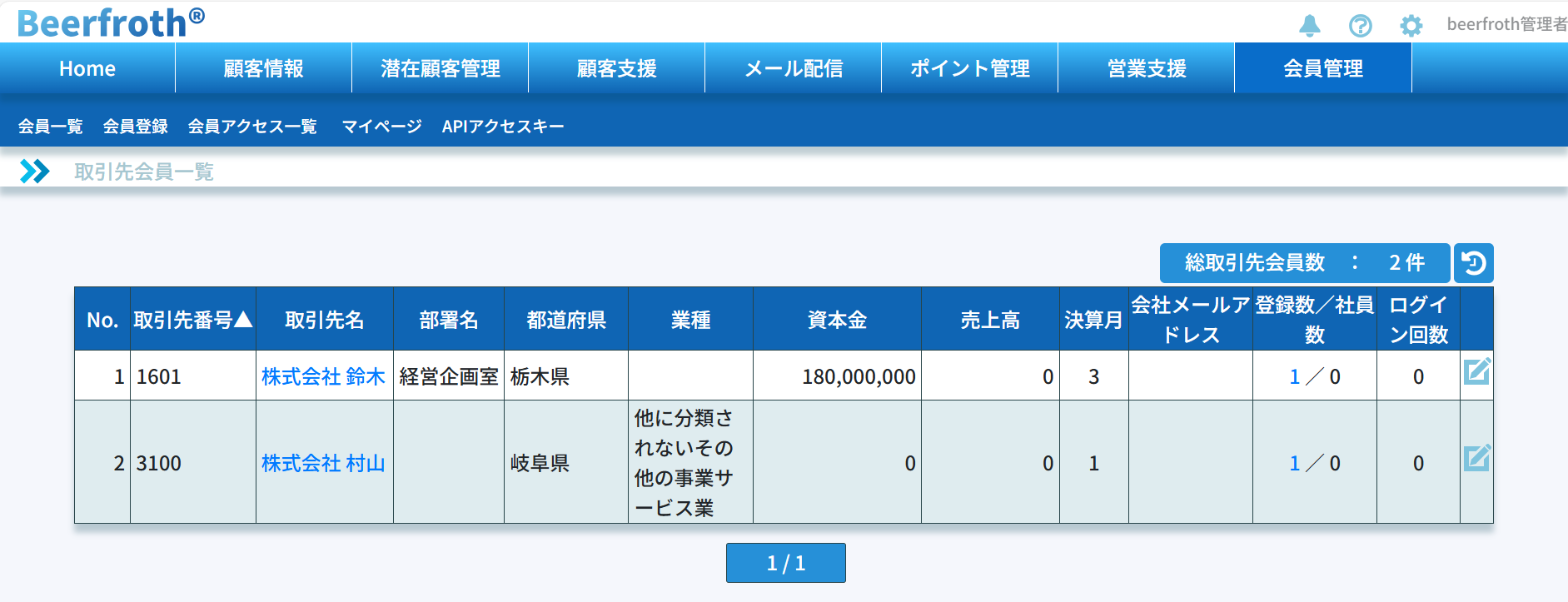 会員アカウントを変更するにはメインメニューで「会員管理」が選ばれている状態で、サブメニューの「会員一覧」をクリックします。