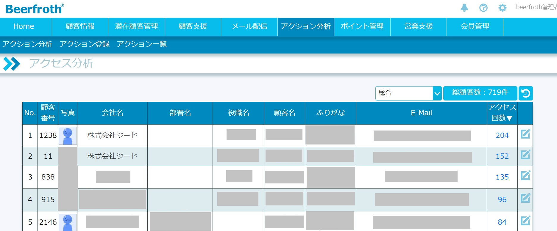メインメニューで「アクション分析」をクリックすると、アクション分析機能の画面に移動します。情報表示欄にはアクセス分析が表示されます。
