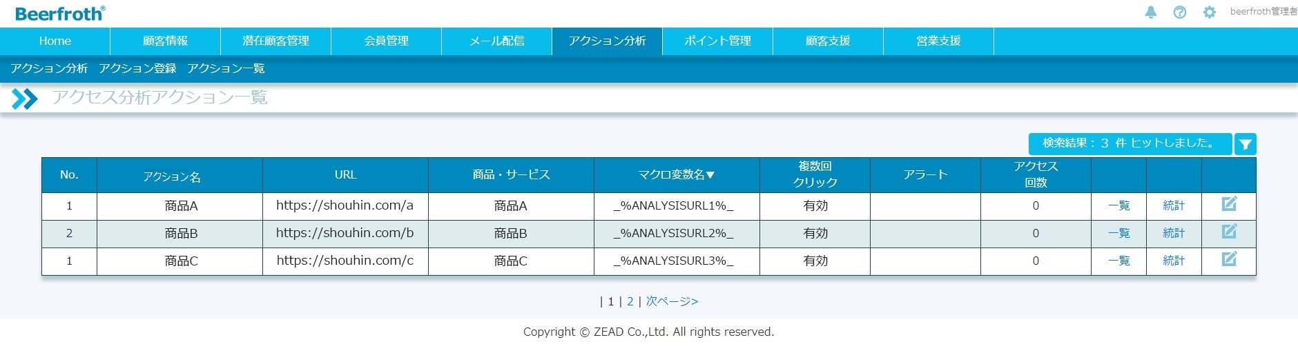 「アクセス分析アクション一覧」画面に入ると、現在登録されているアクションがリスト表示されます。各アクションの「マクロ変数名」項目がリンクを生成するマクロ[1]となります。