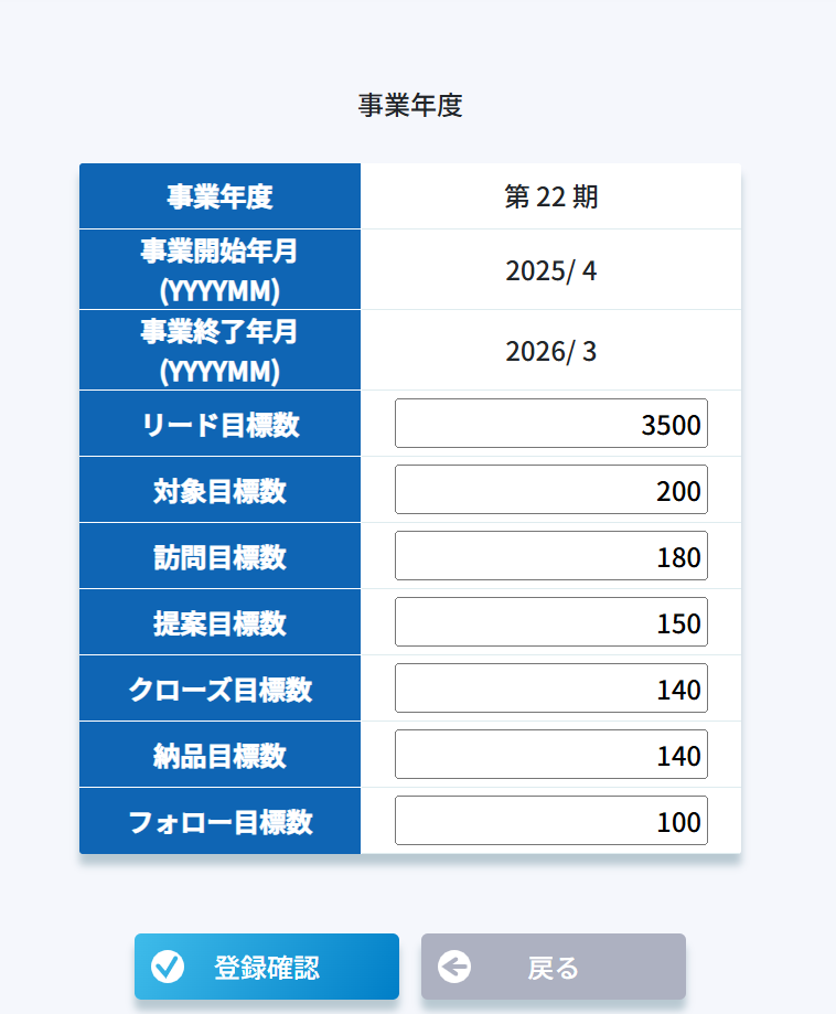 「事業年度」「リード」から「納品」「フォロー」に至るまでの目標を決め設定します。項目をすべて埋め「登録確認」をクリックすると確認画面へ遷移します。確認して問題なければ「登録」してください。