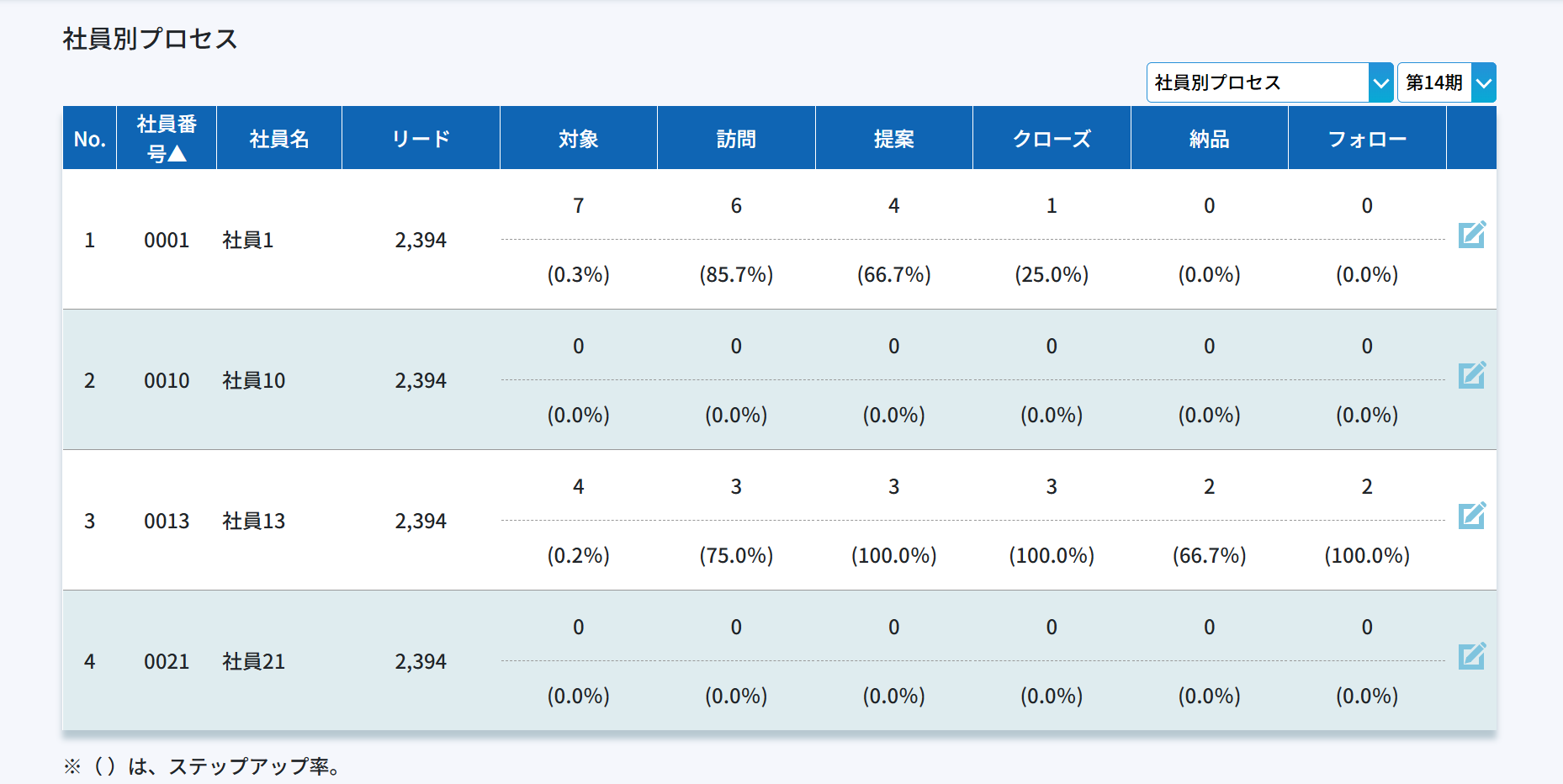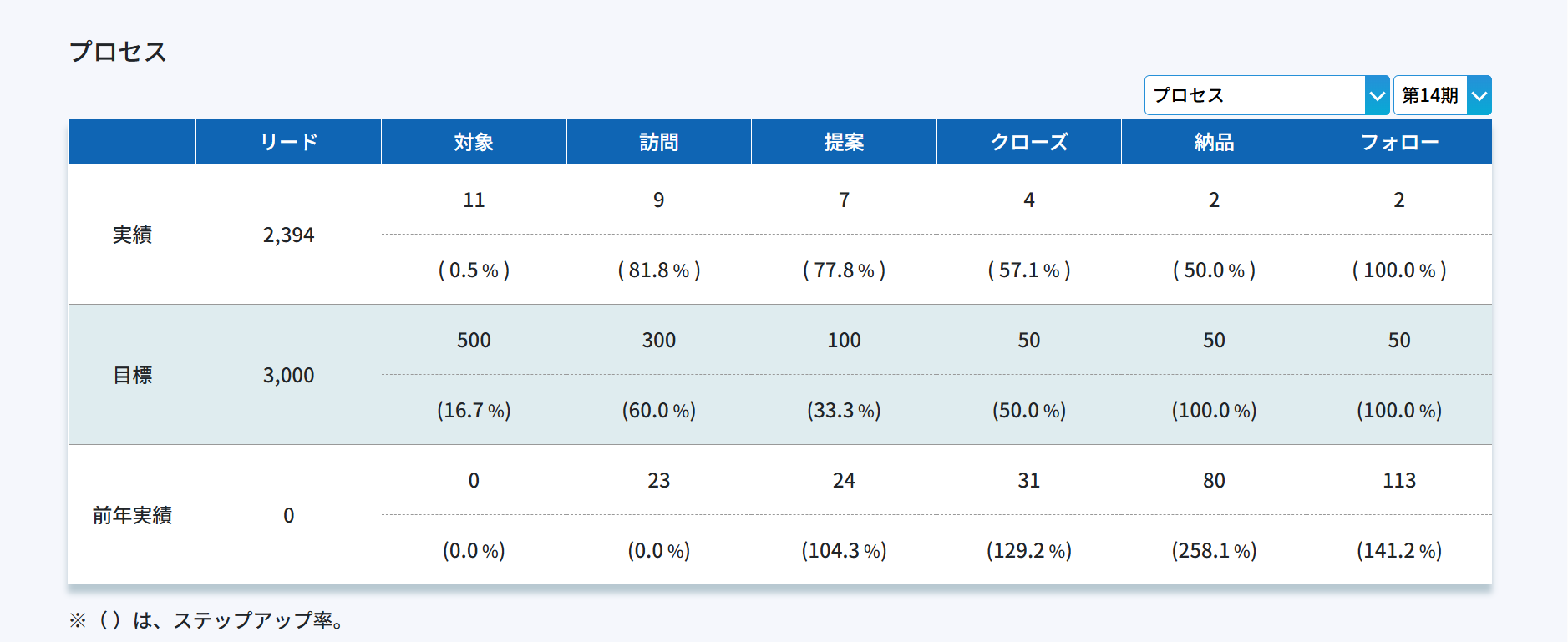 組織全体としての営業状態を眺めることが可能です。また重要なのは外的要因なども踏まえ前年度や前々年度と比較してみる事です。ただ、組織にとって重要なことは必ずしもステップアップ率とは限りません。100件の売上よりも1件の売上が上回る事もあるので他項目とあわせてご覧ください。