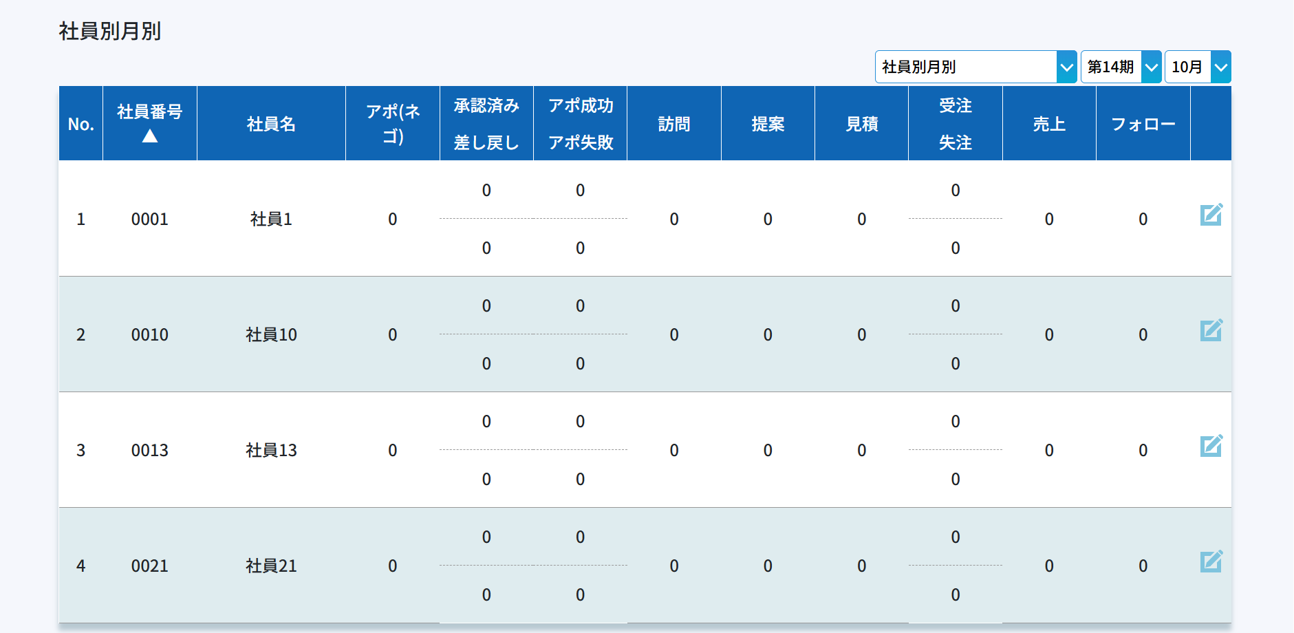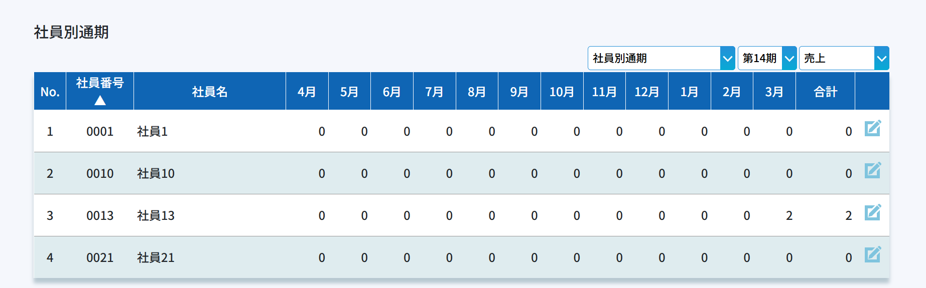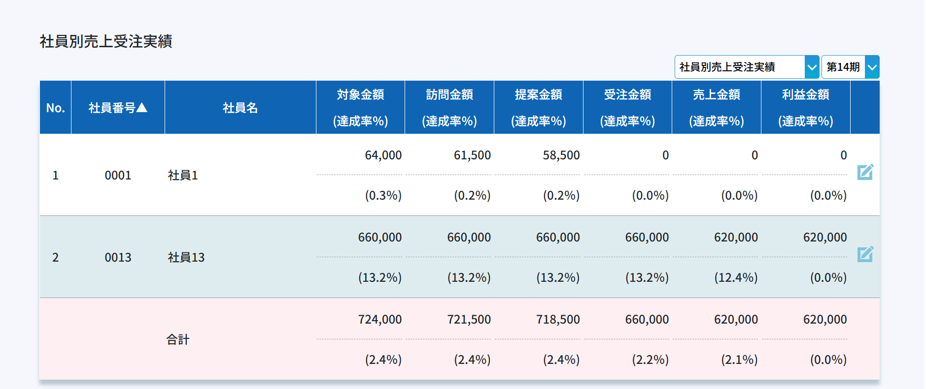 期別、月別に社員ごとの実績が確認できます。季節が関係する業種では重要な項目です。数字が表示されるのは各進捗が発生した月です。