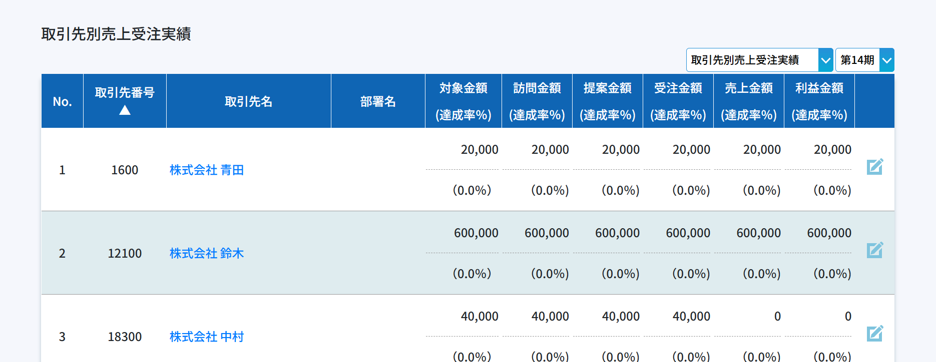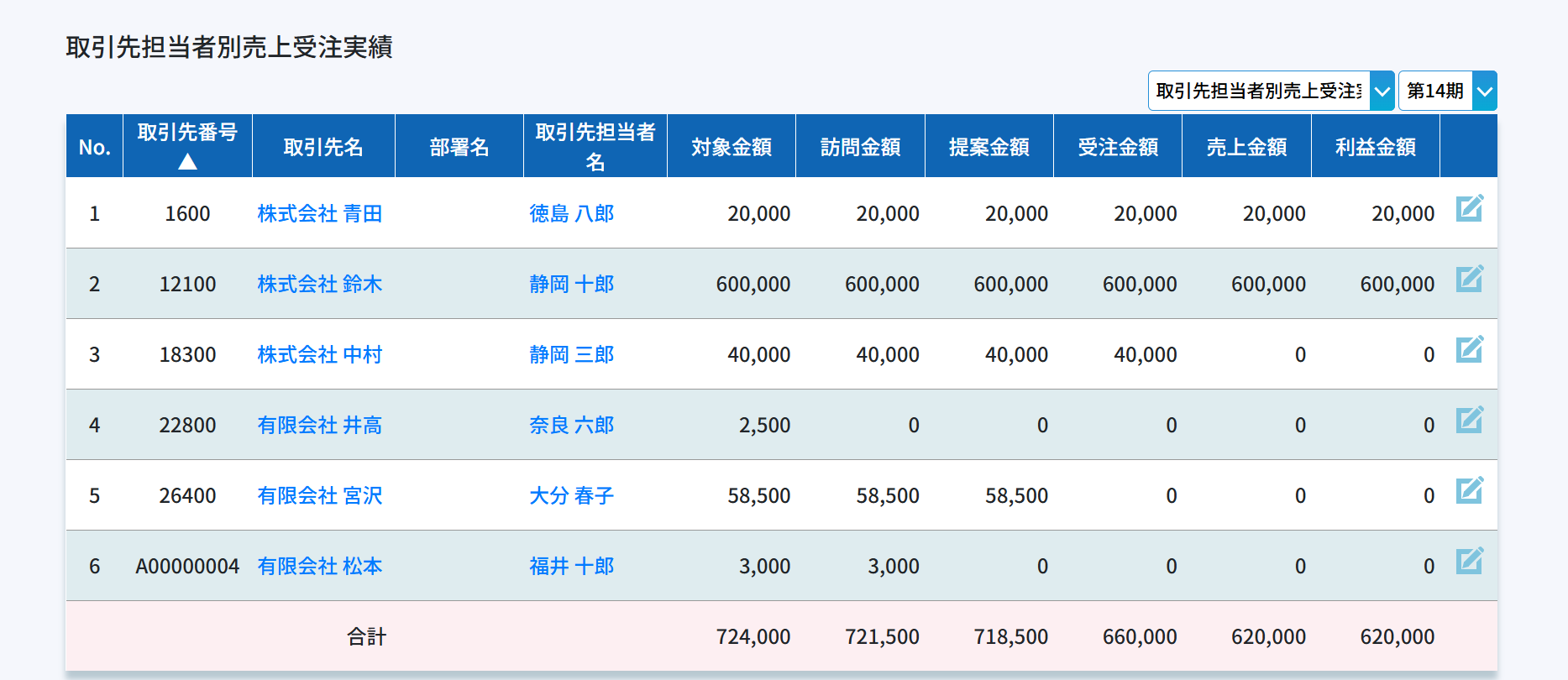 取引先担当者別の各営業プロセス毎の実績値になります。取引先の担当者別の実績を把握するために役に立ちます。