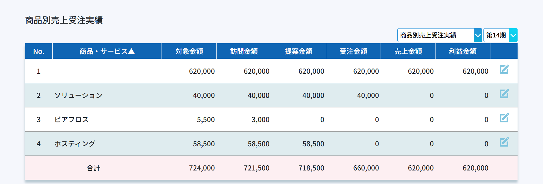 商品別の各営業プロセス毎の実績値になります。商品別の実績を把握するために役に立ちます。