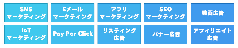 | SNSマーケティング | TwitterやFacebookに広告を投稿したり、拡散させる |