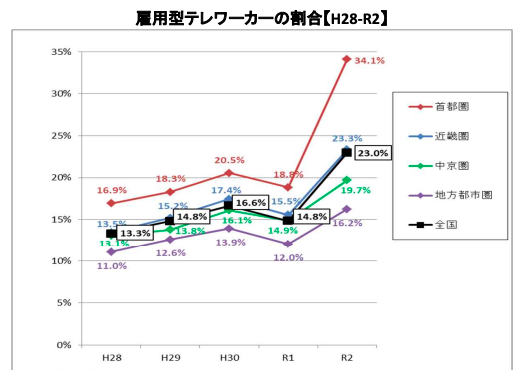 調査によると、全国的にテレワークを導入した企業は増加しており、都市部では特に顕著です。